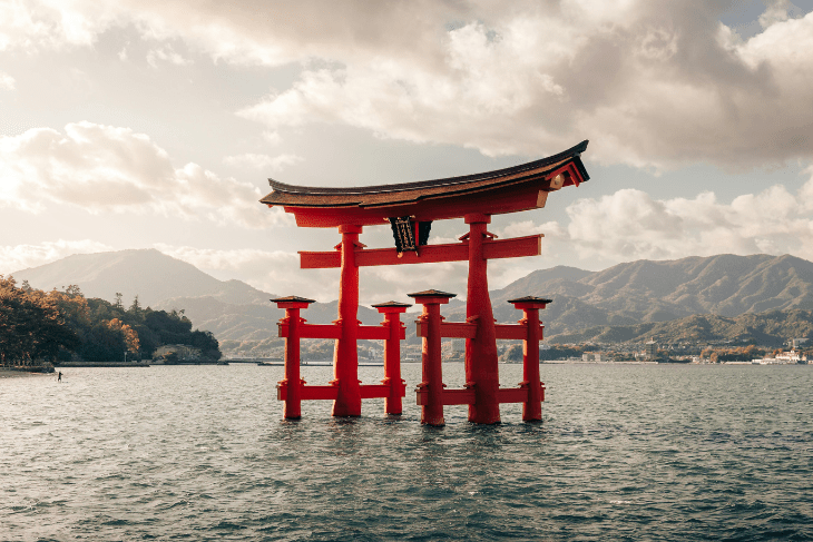 Dès votre arrivée en ferry, vous apercevrez le célèbre torii rouge flottant, symbole de l’île. À marée haute, il semble poser sur l’eau ; à marée basse, vous pouvez marcher jusqu’à ses pieds.